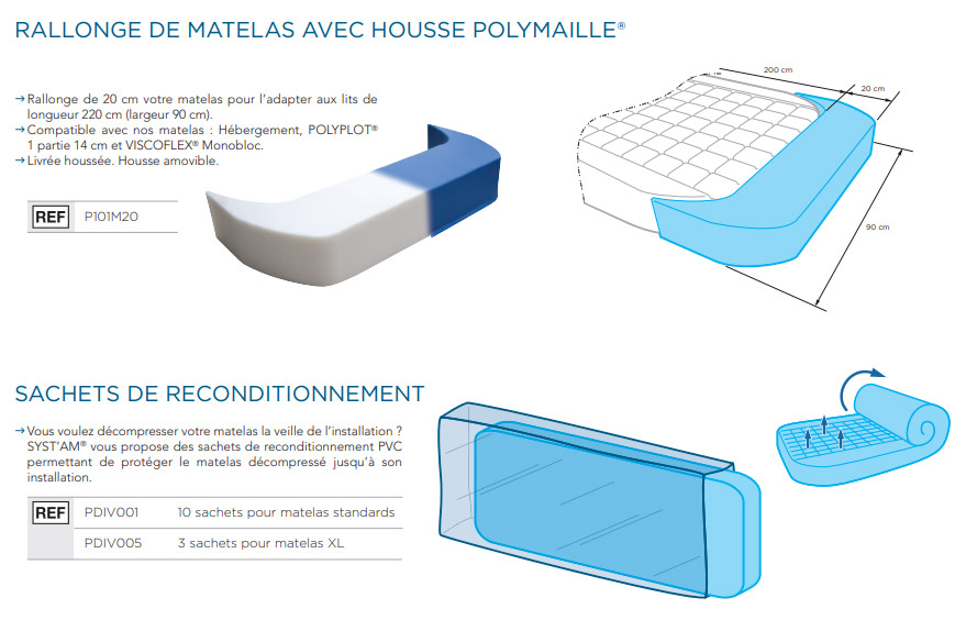 • Une base monobloc et 6 modules avec surface moulée en forme de gaufrier et trois portances adaptées au poids des zones du corps.